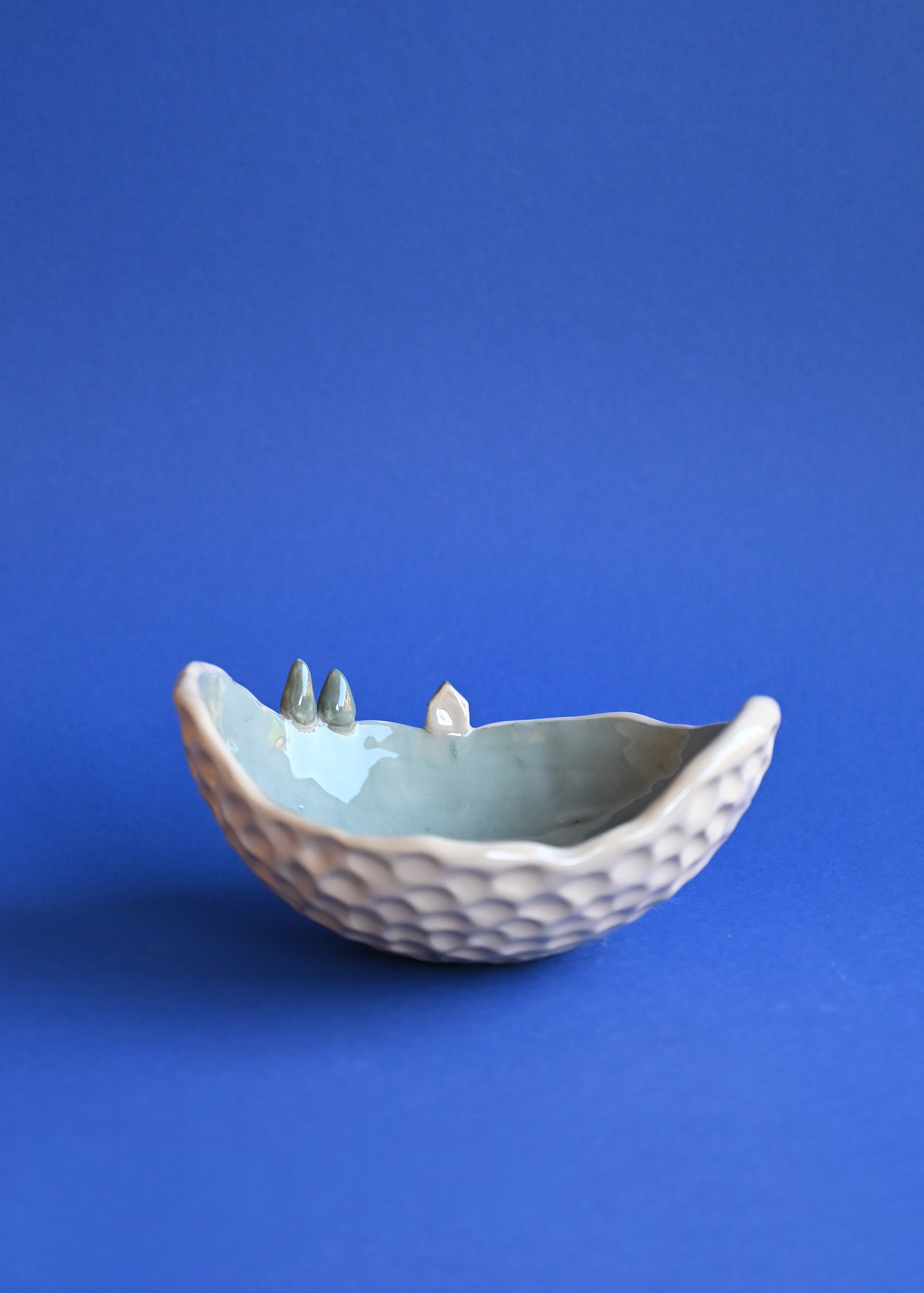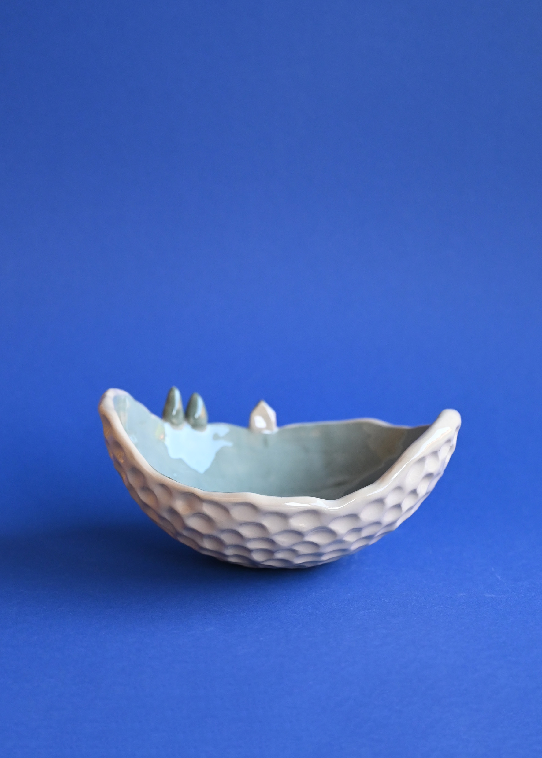 Keramická miska je vyrobená z bielej hliny, je ručne modelovaná a glazovaná.