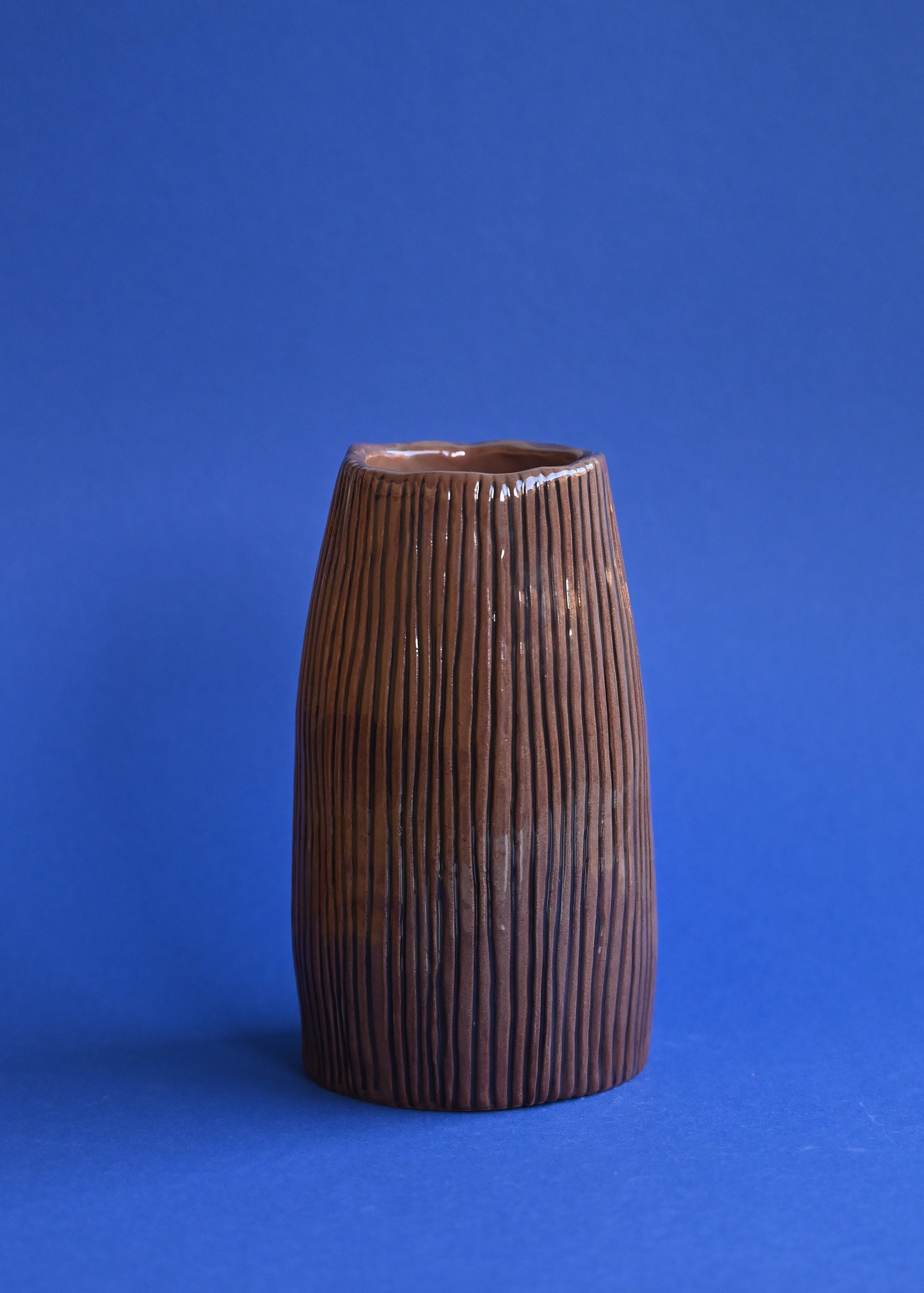 Keramická váza je vyrobená z červenej hliny. Ručne modelovaná s tenkými vrúbkami čiernej farby, má nepravidelný tvar a je glazovaná priehľadnou glazúrou.